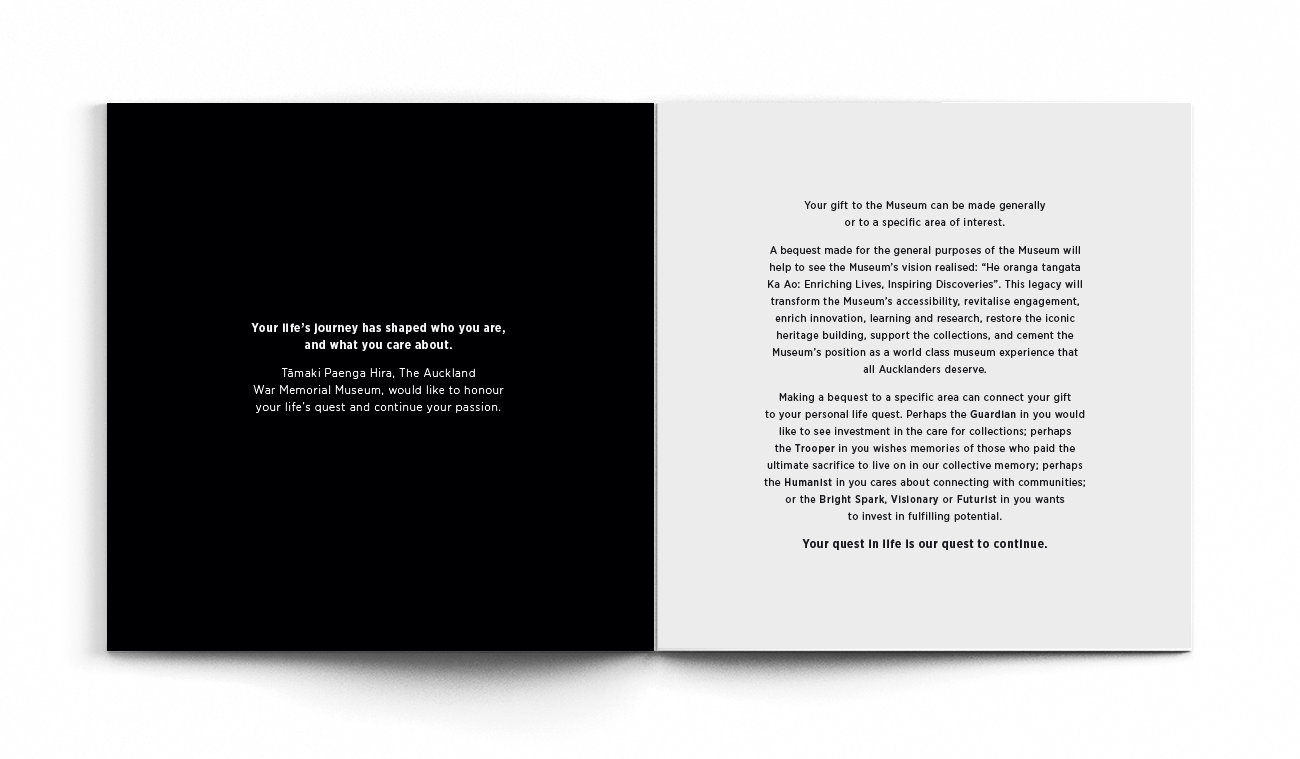Making a bequest is a very personal, private and strange process to go through. The Auckland War Memorial Museum wanted to reach out to a select few supporters, and make leaving a bequest more about continuing their life’s legacy. Whatever that may be.