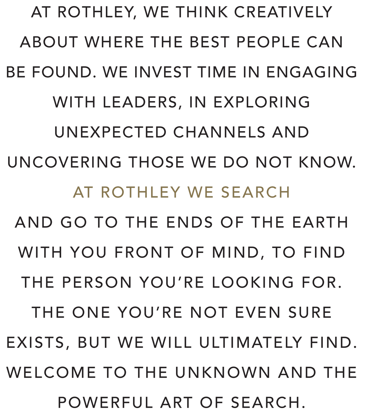 Rothley are an executive search and recruitment company unlike others. This lovely team needed a hero piece of collateral that told their differentiation story. This booklet was printed with die cuts and translucent pages, revealing layers of text and playing with the concept of search.